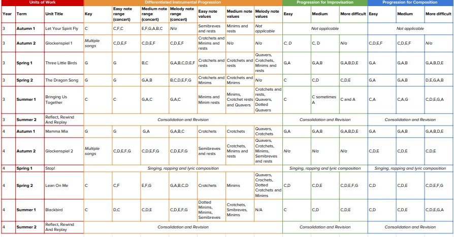 Teachers at Manland use resources which bring all the possible musical learning outcomes together for the end of year and Key Stage, linking to the Progressive Teacher and Children’s Statements within the Assessment Framework. It highlights differentiated and deeper learning for each child that constantly builds through each step/lesson, unit and year: